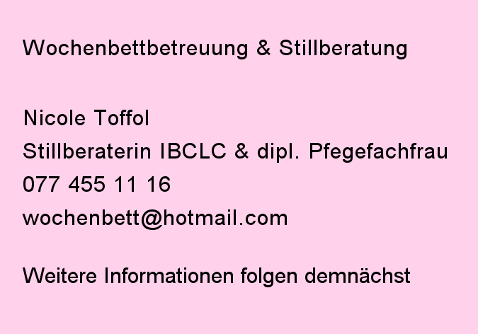 Ich freue mich schon heute Sie bei Ihrem gemeinsamen Start als Familie zu Hause begleiten zu dürfen. Rufen Sie mich frühzeitig gegen Ende Schwangerschaft an, um eine Betreuung zu gewährleiten.